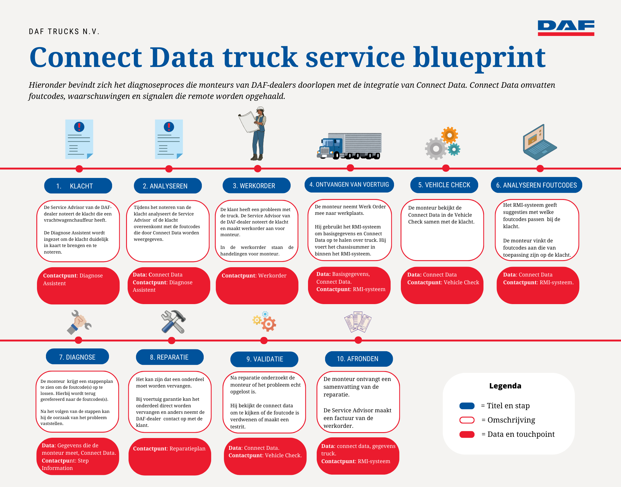 De service blueprint brengt de verschillende fasen binnen het diagnoseproces in kaart. Hierbij wordt per fase aangegeven welke data de monteurs van de DAF-dealer nodig hebben.