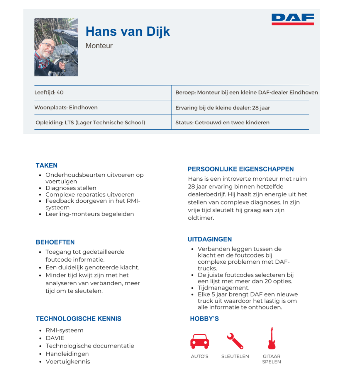 De persona’s laten zien dat leerling-monteurs andere behoeften hebben dan ervarenmonteurs. Hans van Dijk, een ervaren monteur, heeft behoefte aan informatie waarmee hij snel verbanden kan leggen tussen foutcodes. Hij wil snel werken en heeft behoefte aan duidelijke informatie.