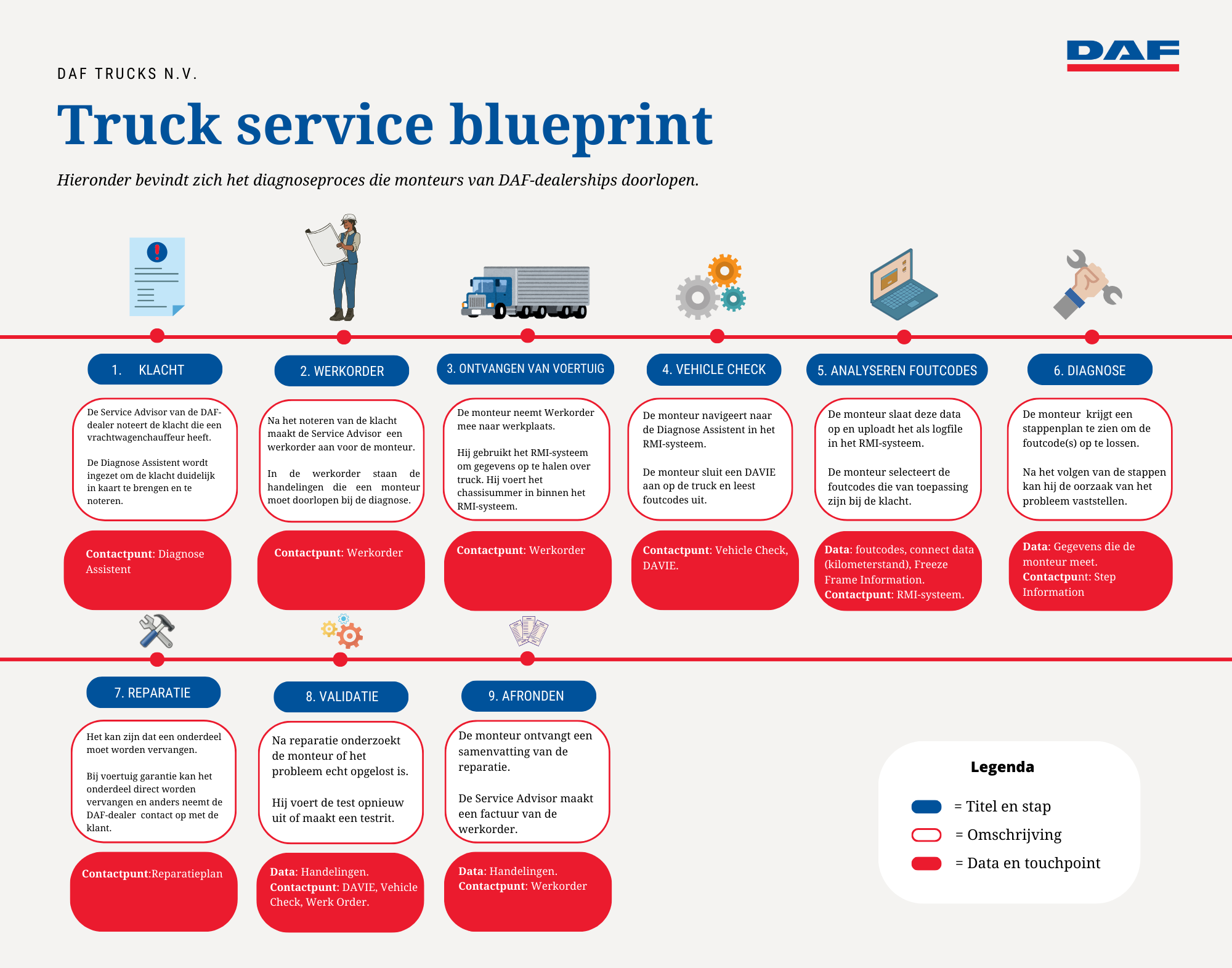 De service blueprint brengt de verschillende fasen binnen het diagnoseproces in kaart. Hierbij wordt per fase aangegeven welke data de monteurs van de DAF-dealer nodig hebben.